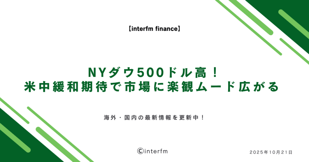 おはようございます!FX編集部の田中です☀️ 昨日(10月20日)の海外市場は、米中貿易摩擦の緩和期待を背景に、リスクオン相場が継続しました。NYダウは500ドル超の大幅高となり、投資家心理の改善が顕著に表れた一日となりました。 それでは、昨晩から本日...