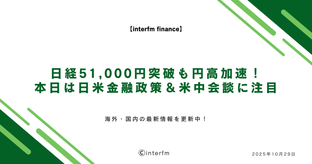 おはようございます!FX編集部の田中です。 昨日29日の市場は大きな動きが目白押しでした。日経平均が史上初の51,000円台に到達する一方、ベッセント米財務長官の発言でドル円が急落するなど、株式と為替で明暗が分かれる展開となりました。本日30日は日米... -