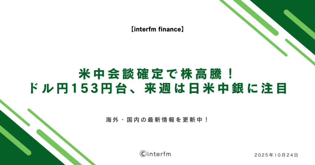 おはようございます!FX編集部の田中です☀️ 昨日10月24日の海外市場は、米中首脳会談の確定や米CPIの発表を控えた動きなど、まさに「動く相場」でした。ドル円は153円台に乗せる場面もあり、久しぶりの円安水準となりましたね。 それでは、昨日の主要ニュ... -
