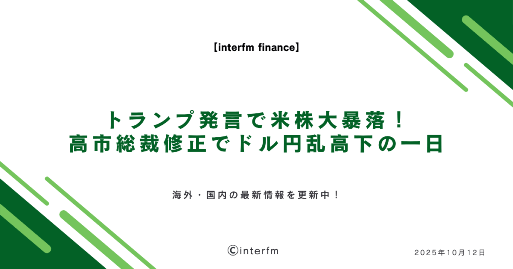 おはようございます!FX編集部の田中です。 今朝も皆さまに最新の海外FX・投資関連ニュースをお届けいたします。 昨日(10月11日)の海外市場は、トランプ大統領の対中警告発言を受けて大きく動揺しました。米国株は軒並み大幅安となり、為替市場でもリス... -