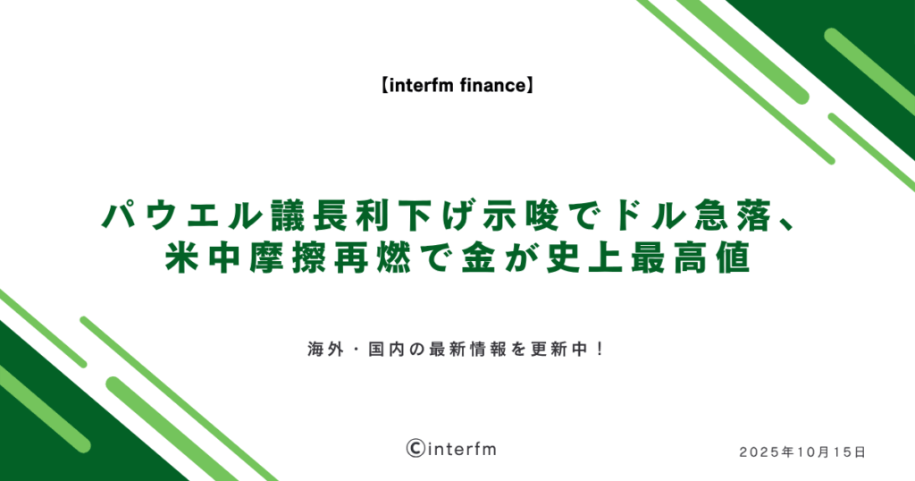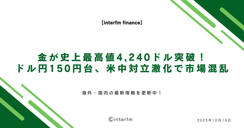 昨日の海外市場は、米中貿易摩擦の激化と米政府閉鎖の長期化を背景に、明確なリスク回避の動きが見られました。金価格は史上最高値を更新し続け、ドル円も150円台前半まで下落するなど、市場は不安定な状況が続いています。本日も注目のニュースが目白押し... -