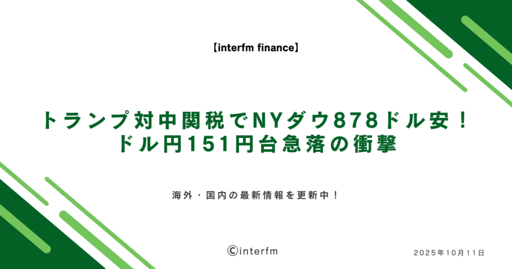 2025年10月11日(土)朝10時のマーケット情報をお届けします。 昨日の海外市場は、まさに「嵐の一日」となりました。トランプ大統領の突然の対中関税発表により、株式市場は大幅下落、為替市場では円高・ドル安が急速に進行するなど、リスクオフムードが市... -