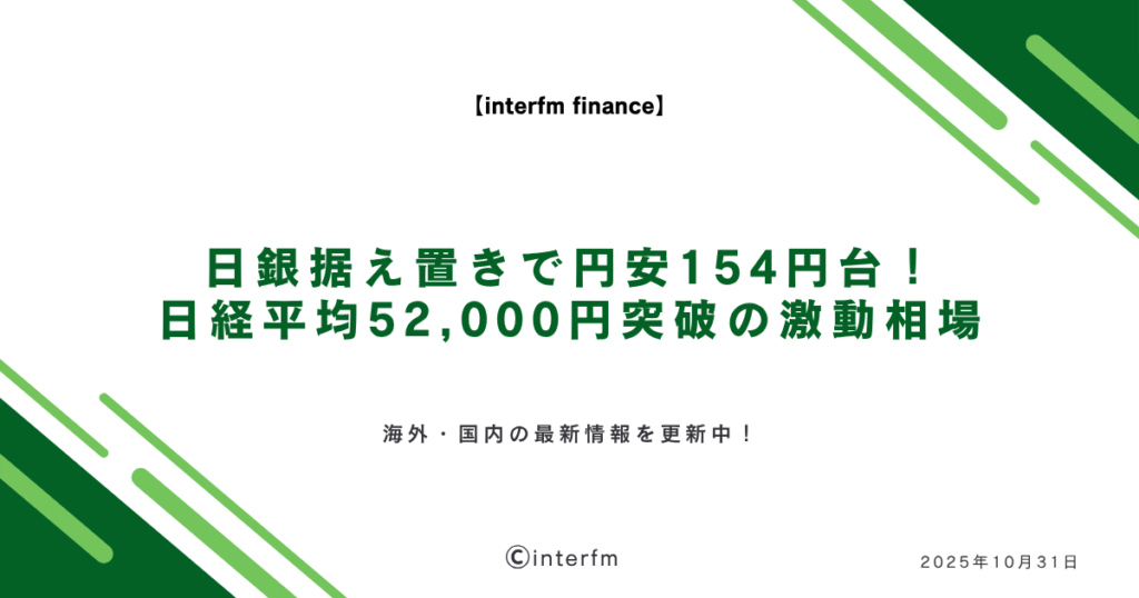 皆さま、おはようございます!FX編集部の田中です。 10月最終日となった昨日は、日銀の政策据え置き決定を受けて為替市場が大きく動いた一日となりました。ドル円は154円台まで円安が進み、約8カ月ぶりの水準を記録しています。一方、日経平均株価は史上初...