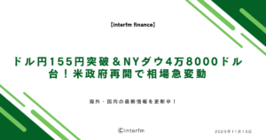 この発表を受けて、米国株式市場では前日のNYダウが144ドル高(+0.30%)の46,734ドルで反発。24日の東京市場でも日経平均株価が658円高(+1.35%)の49,299円と3日ぶりに反発し、最高値(49,316円)にあと一歩まで迫りました。