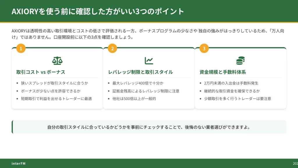 これらのデメリットは、見方を変えれば「ボーナスに頼らず純粋な取引環境の質で勝負している」というAXIORYの姿勢の表れとも言えますね。