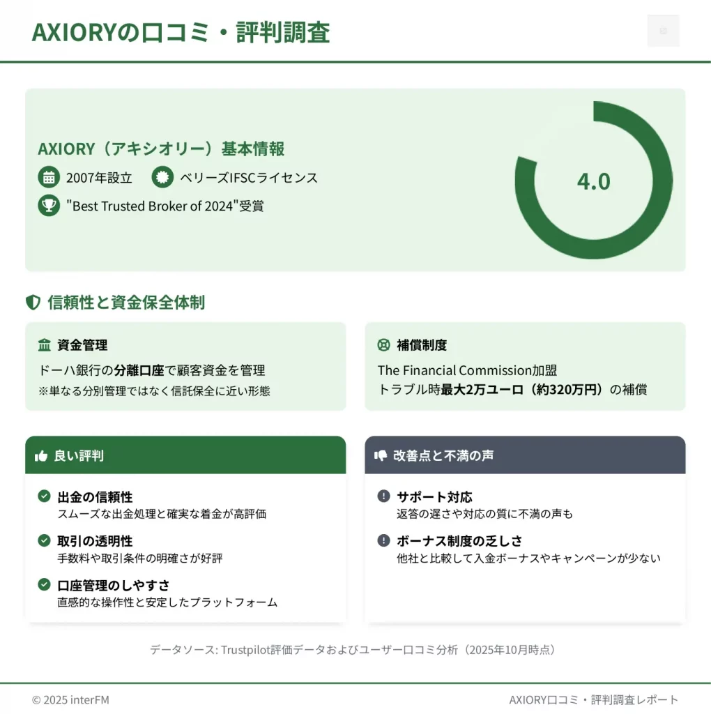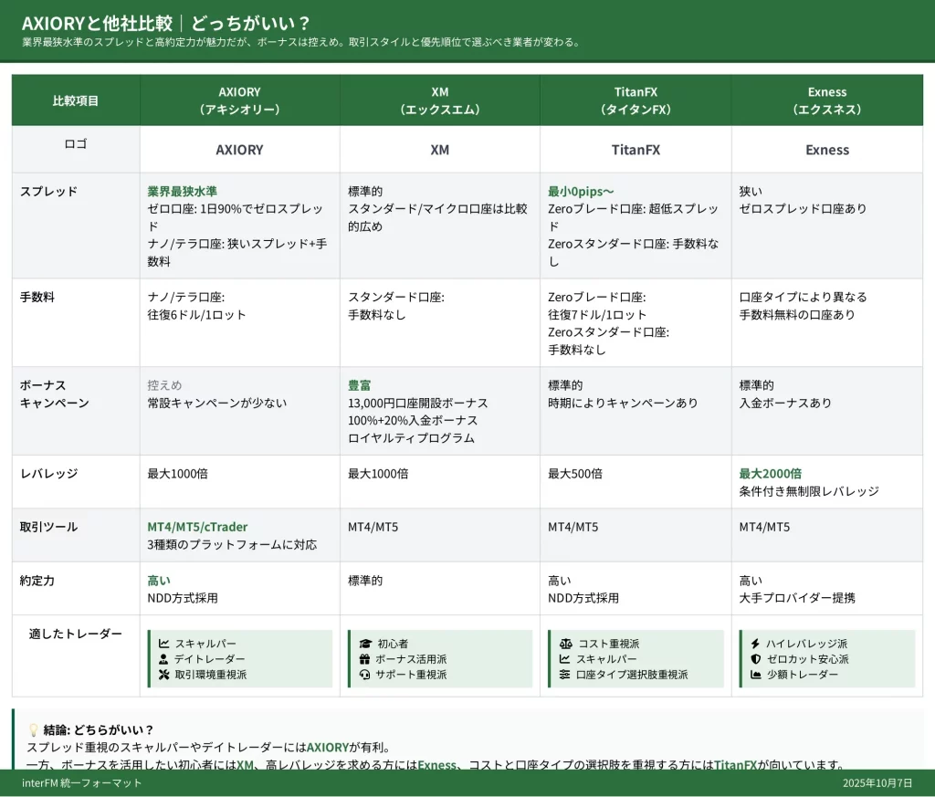 この記事では、AXIORYの実際の利用者300人以上の口コミを分析し、2024〜2025年の最新の出金トラブル事例、4つの口座タイプの実測スプレッド、XM・TitanFX・Exnessとの詳細比較表を掲載しています。