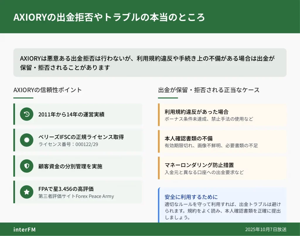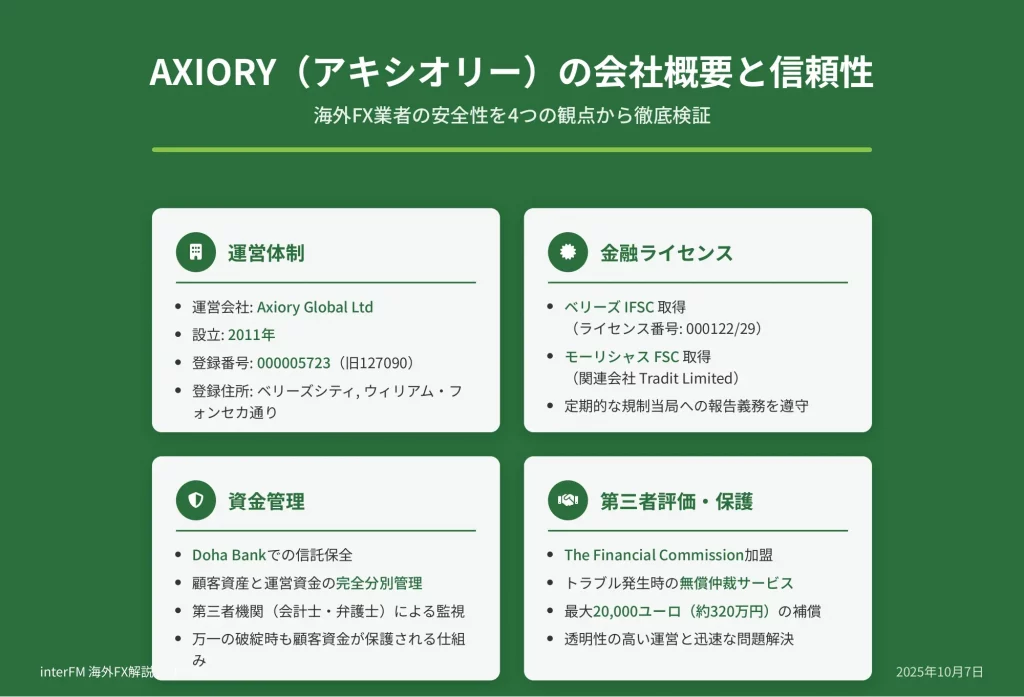 - 金融ライセンス:ベリーズIFSCライセンス保有(Axiory Global Ltd.)