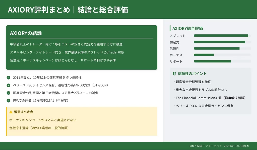 さらに金融ライセンスの信頼性、約定力の実態、トレードスタイル別の相性診断まで、あらゆる角度からAXIORYを徹底検証しました。