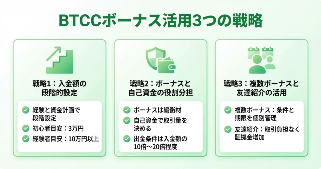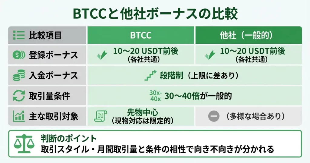 BTCCには複数のボーナスプログラムがあり、それぞれ受取条件や出金ルールが異なります。他社との比較材料として、金額だけでなく実際に使える条件を正確に理解することが重要です。