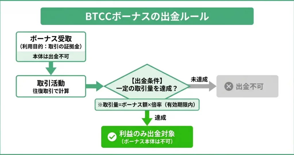 BTCCのボーナスには出金に関する制約と条件が設定されており、それを正しく理解しておかないと想定外の制限に直面する可能性があります。