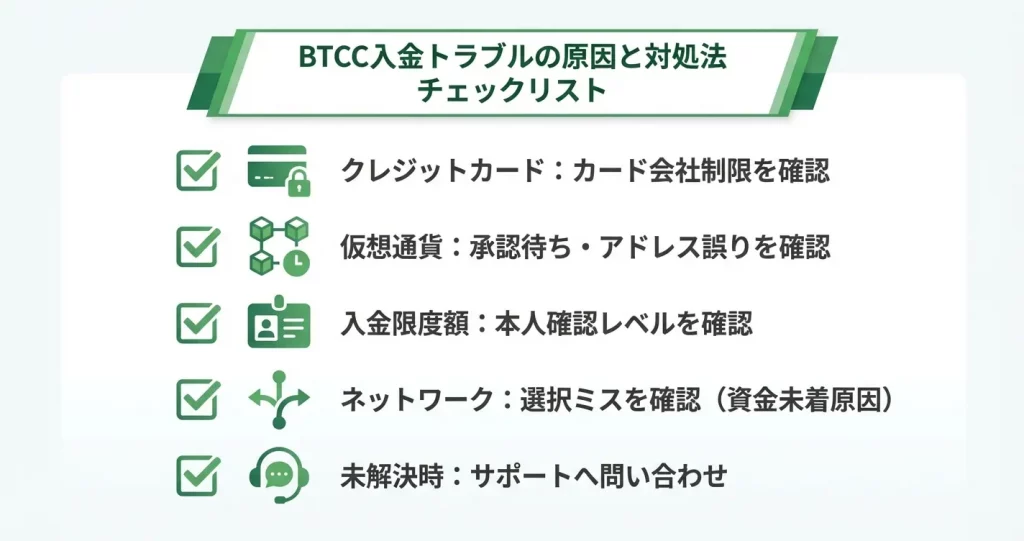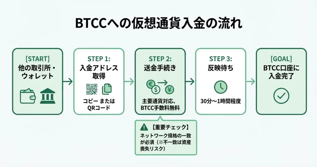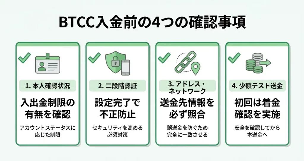 BTCCへの入金は手順自体は簡単ですが、安全性やトラブル回避のために事前に押さえておくべきポイントがあります。
