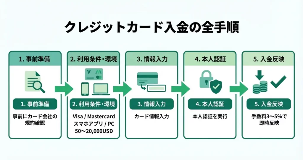 このセクションでは、対応カードブランドの確認から実際の操作手順、手数料と反映時間まで、クレジットカード入金に必要な情報を順に解説します。
