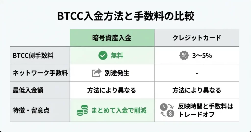 暗号資産での入金では、BTCC側の手数料は無料とされていますが、送金元の取引所やウォレットでネットワーク手数料が別途発生する点に注意が必要です。