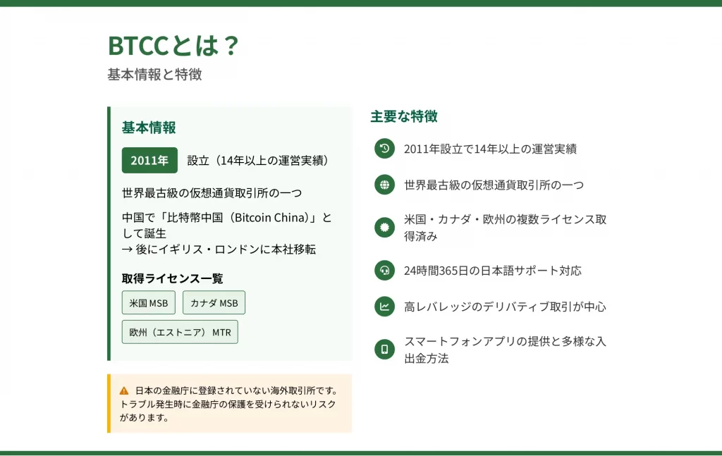 BTCCは2011年設立、14年以上の運営実績を持つ世界最古級の仮想通貨取引所。複数の国際ライセンスを取得し、高レバレッジのデリバティブ取引を中心に展開しています。
