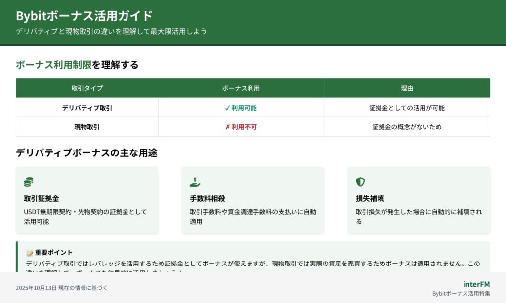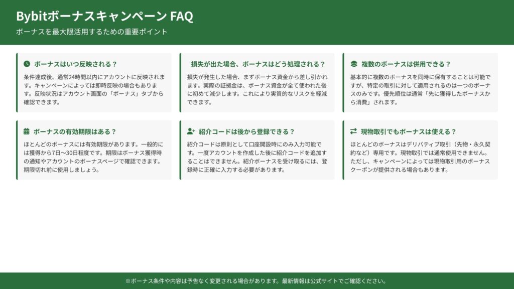 法定通貨ボーナスについては、現在Bybitカード取引にのみ適用されるとの公式情報があり、これも現物取引には利用できません。