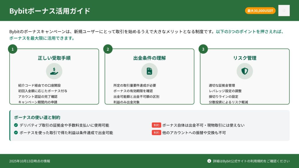 以下の3つのポイントを正しく理解することで、Bybitのボーナスを最大限に活用できます。