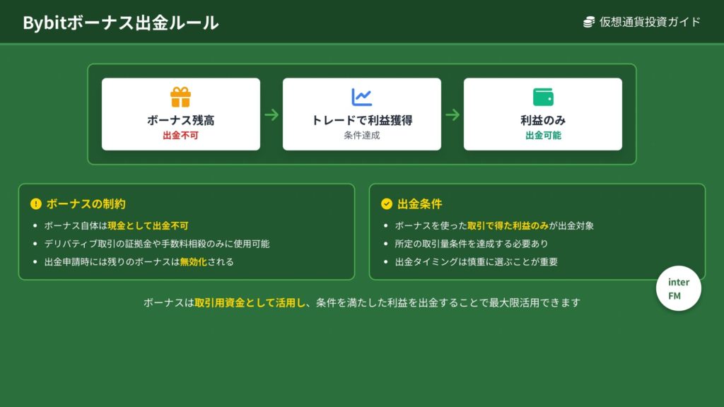 Bybitのボーナスで得た利益を出金するには、所定の取引量条件をクリアする必要があります。
