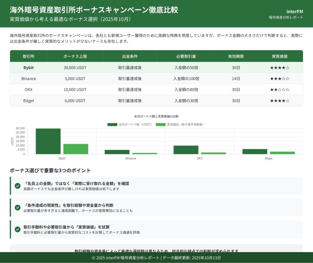 この記事では、Bybitで今もらえる全ボーナスの最新情報から、紹介コード入力を含む失敗しない受け取り手順、デリバティブと現物での使い方の違い、出金条件を効率的にクリアする方法、禁止事項とアカウント凍結リスク、さらにBinanceやOKXなど主要取引所との詳細比較まで、実践的な情報を網羅的に解説します。
