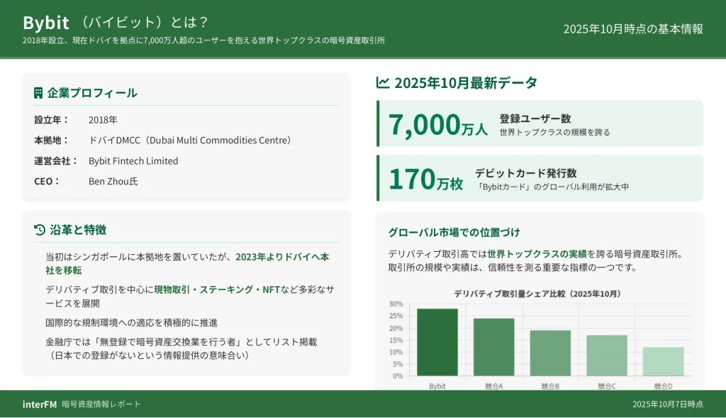 Bybitは2018年設立、現在ドバイを拠点に7,000万人超のユーザーを抱える世界トップクラスの暗号資産取引所