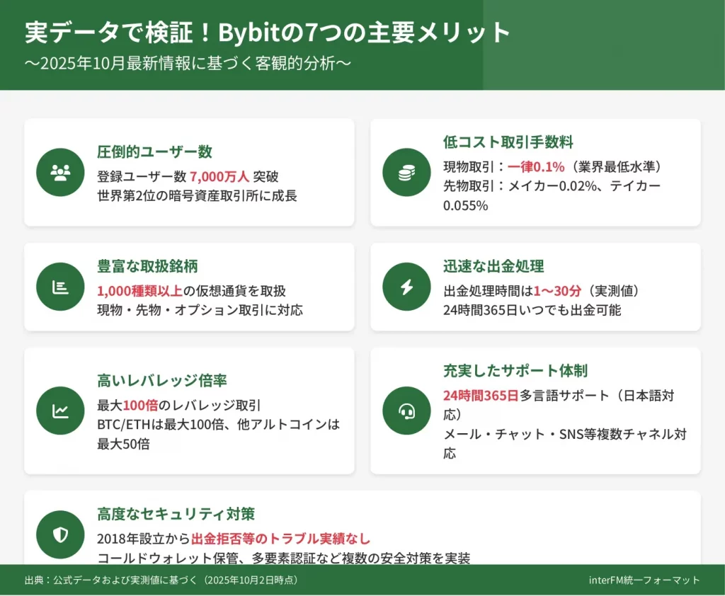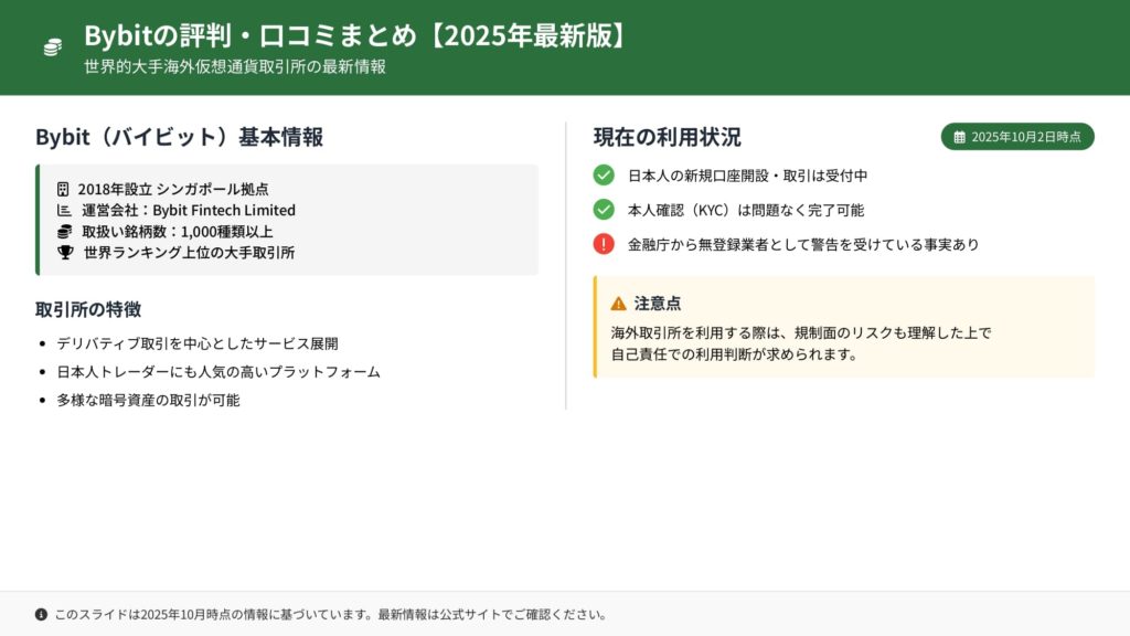 この記事では、Bybitの良い評判7つと悪い評判5つを2025年11月最新データで徹底検証。金融庁警告の実態、Binance・国内取引所との5項目比較表、出金スピード・セキュリティの実測値、コピートレード・取引ボットの使い勝手まで、実データと実際の口コミをもとに解説します。