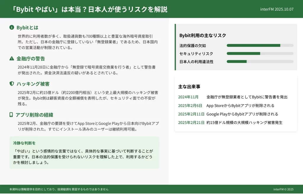 2025年11月時点ではBybitは日本人向けサービスを強化しており撤退の兆しは見られませんが、規制動向には常に注意を払い、公式発表や金融庁の情報をチェックする習慣をつけてください。