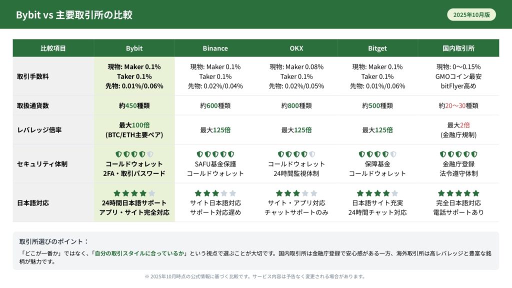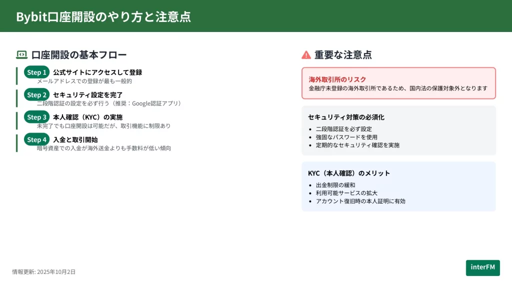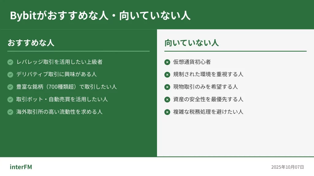 もしあなたが仮想通貨取引の経験があり、海外取引所のリスクを理解した上で、分散管理やセキュリティ対策を徹底できるなら、Bybitは強力な選択肢となります。