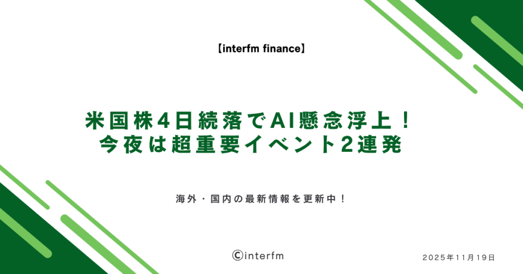 おはようございます!FX編集部の田中です☀️ 昨日18日の海外市場は、久しぶりに大きな動きがありましたね。米国株式市場が4日連続で下落し、特にAI関連銘柄を中心に売りが広がりました。本日は、昨晩から今朝にかけての重要なニュースをお届けします。市場... -