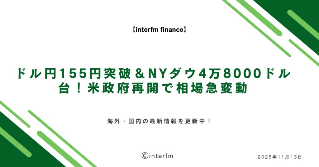 おはようございます!FX編集部の田中です。 昨日の海外市場は、米国政府機関の閉鎖解除見通しを好感する動きが目立ちました。NYダウが初めて4万8000ドル台に到達し、史上最高値を更新する一方で、ドル円は一時155円台まで上昇し、約9カ月ぶりの高値をつけ...