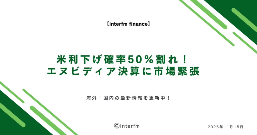皆さま、おはようございます!FX編集部の田中です。 11月14日(木)の海外市場は、FRB(米連邦準備理事会)の12月利下げ観測が大きく後退し、市場全体にリスク回避の動きが広がりました。ダウ平均は309ドル安と続落し、利下げ確率は前週の67%から50%を割り込む... -