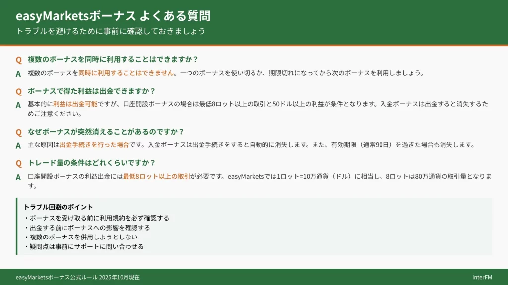 海外FX業者のボーナス選びで失敗すると、せっかくの資金効率が下がるだけでなく、出金条件が厳しすぎて利益を引き出せないという事態にもなりかねません。特にeasyMarketsは入金ボーナスの申請にサポートへの連絡が必要など、他社と異なる手順があるため、正しい知識がないとボーナスを受け取り損ねるリスクもあります。