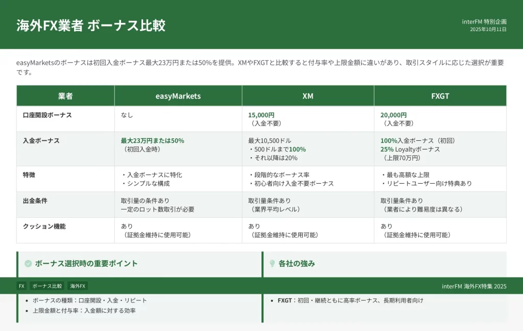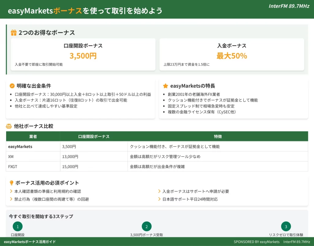 さらに、クッション機能やバニラオプション対応などeasyMarkets独自のメリット、XM・FXGTとの比較表、確実にボーナスをもらうための手順、出金条件をクリアする取引方法まで、実践的な情報を豊富に掲載しています。