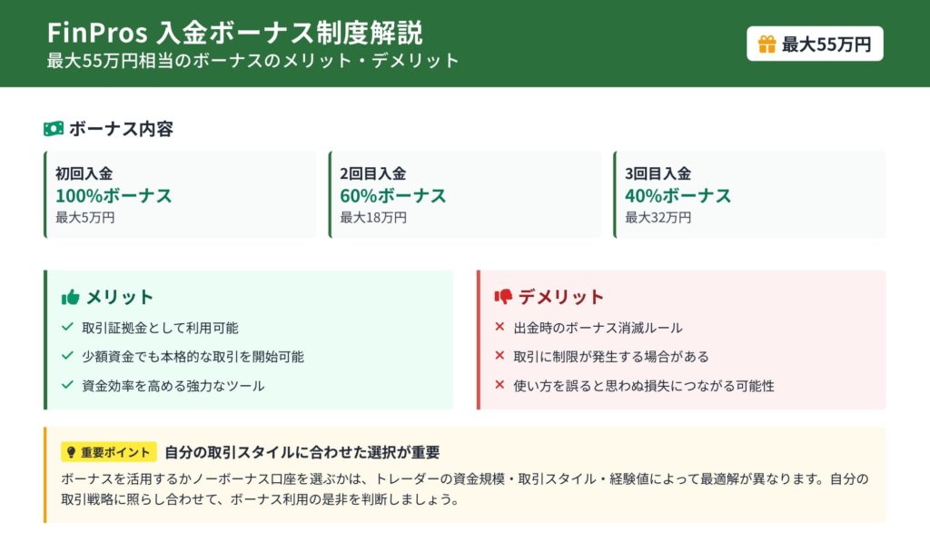 | FinPros | 初回入金100%ボーナス(最大5万円) | 初心者・少額入金のトレーダー |