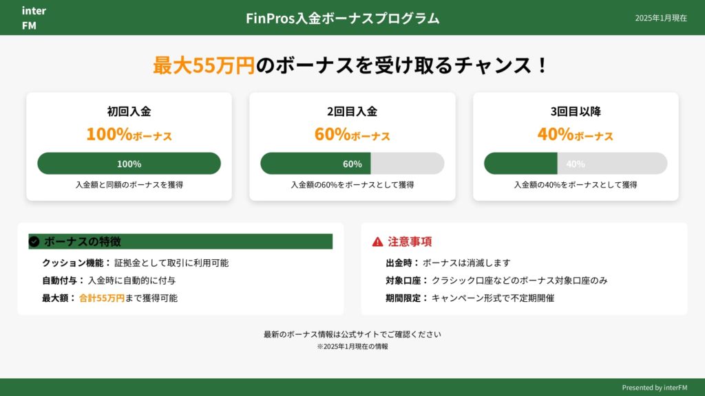 FinProsは段階的な入金ボーナスプログラムを提供しており、2025年1月現在、最大で合計55万円のボーナスを受け取ることが可能です。