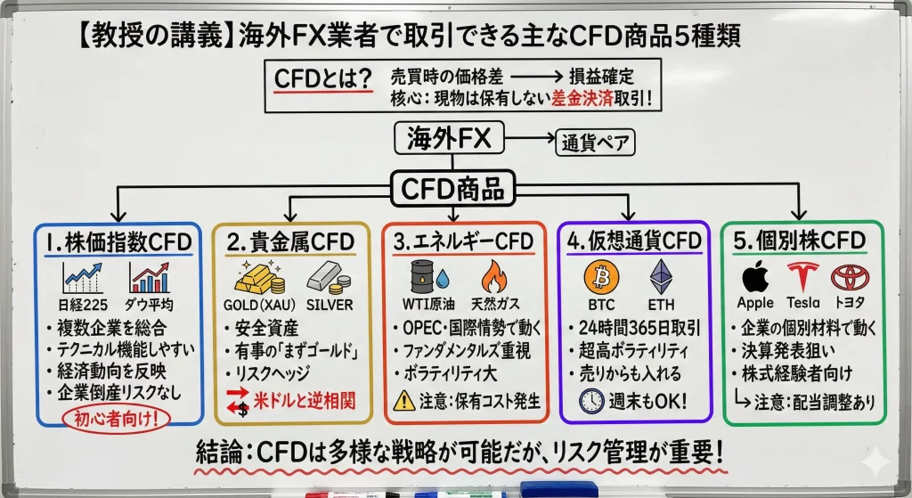 ここでは、海外FX業者で取引できる主要なCFD商品5種類を詳しく解説します。