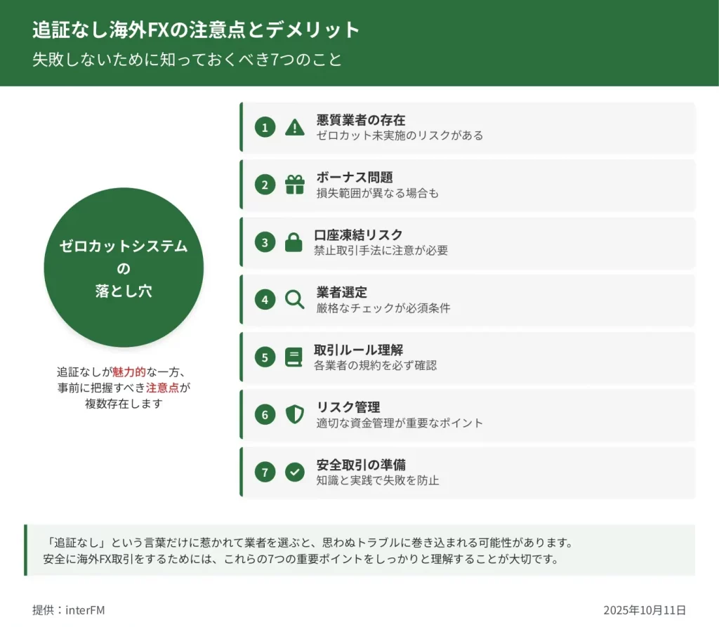 さらに2025年11月最新のおすすめ業者7社を取引スタイル別に比較し、ゼロカット未実施の悪質業者の見極め方、ロスカットや両建て禁止などの注意点、ボーナスのクッション機能まで実践的な情報を網羅しました。