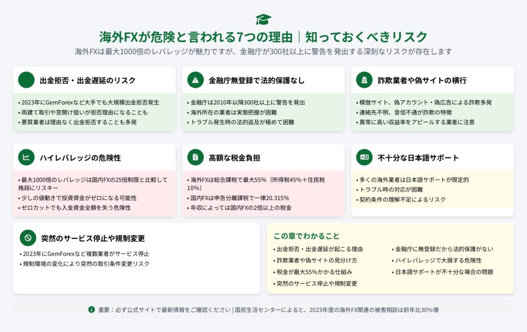 海外FXは高レバレッジとゼロカットの魅力がある一方、出金拒否・詐欺・最大55%の税金・法的保護の欠如という重大なリスクを抱えています