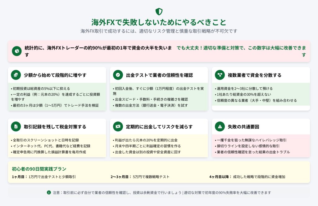 一つでも不安がある場合は、その準備が整うまで海外FXの利用は控え、国内FXで経験を積むことを強く推奨します。