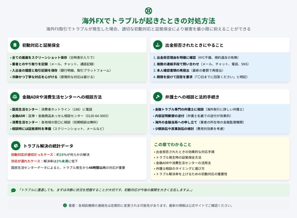 さらに、万が一トラブルに巻き込まれた際の具体的な対処法や相談先も紹介します。