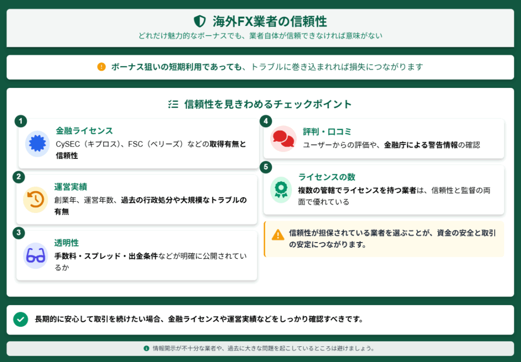口座開設ボーナスを利用する海外FX業者を長く使い続けていきたいなら、信頼性の高さは欠かせません。
