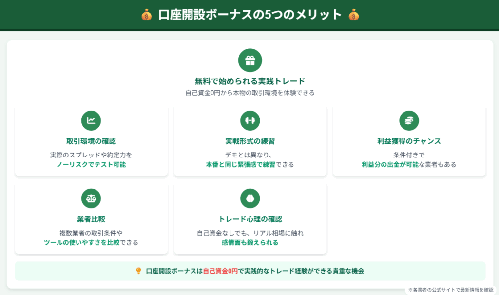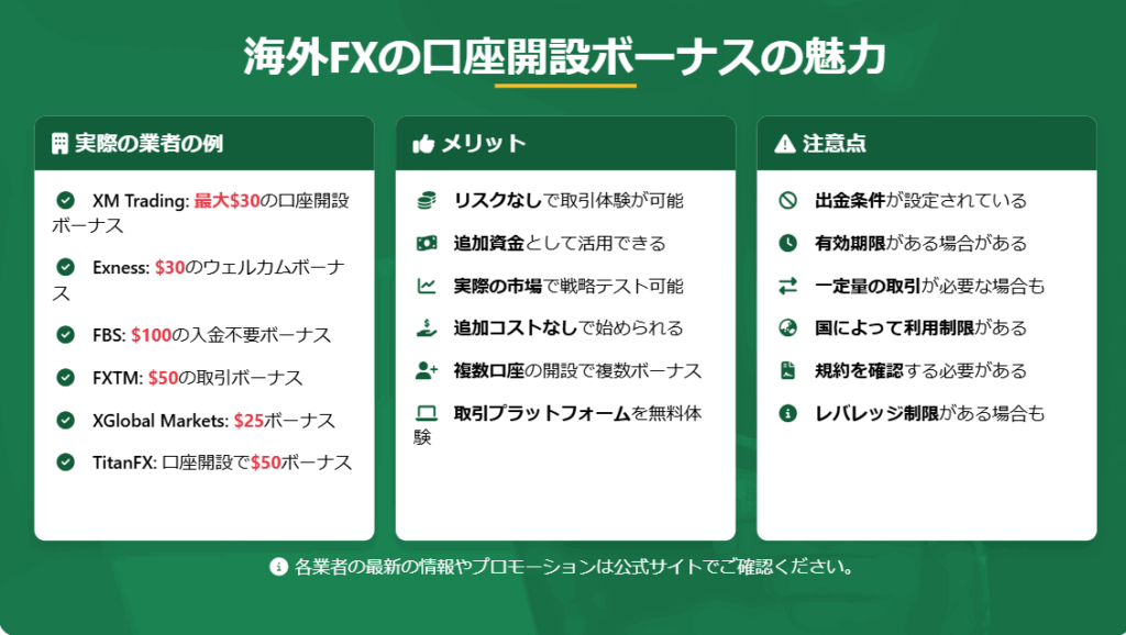口座開設ボーナスは、入金なしでリアルな取引を試せるため、初心者にも人気があります。