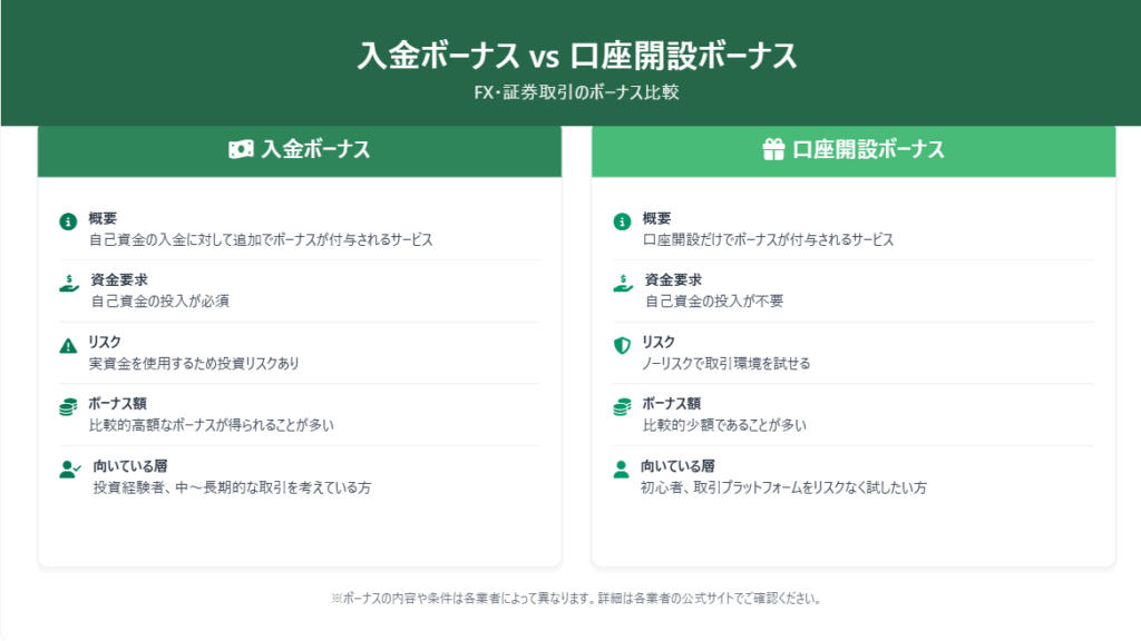 入金ボーナスは自己資金の投入が前提となる一方で、口座開設ボーナスはノーリスクで取引環境を試せる点が大きな魅力です。
