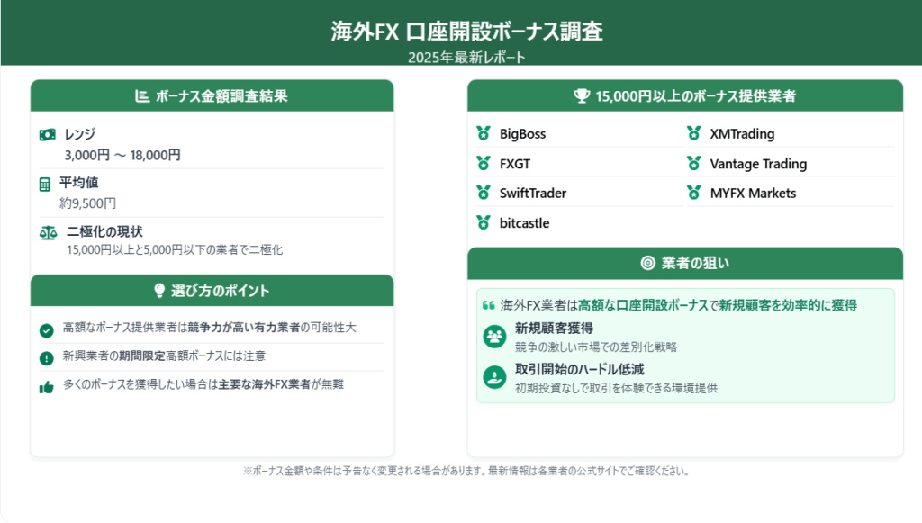 高額な口座開設ボーナスを提供できる海外FX業者は、競争力が高い有力な業者であると判断する材料。