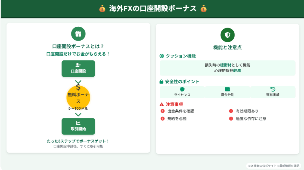 口座開設ボーナスは、海外FX業者が新規ユーザー向けに提供する特典のひとつで、口座開設後に本人確認などの手続きを完了することで付与されるケースが一般的です。