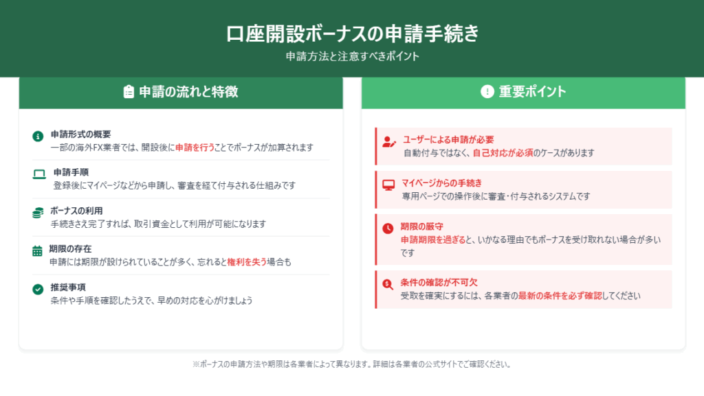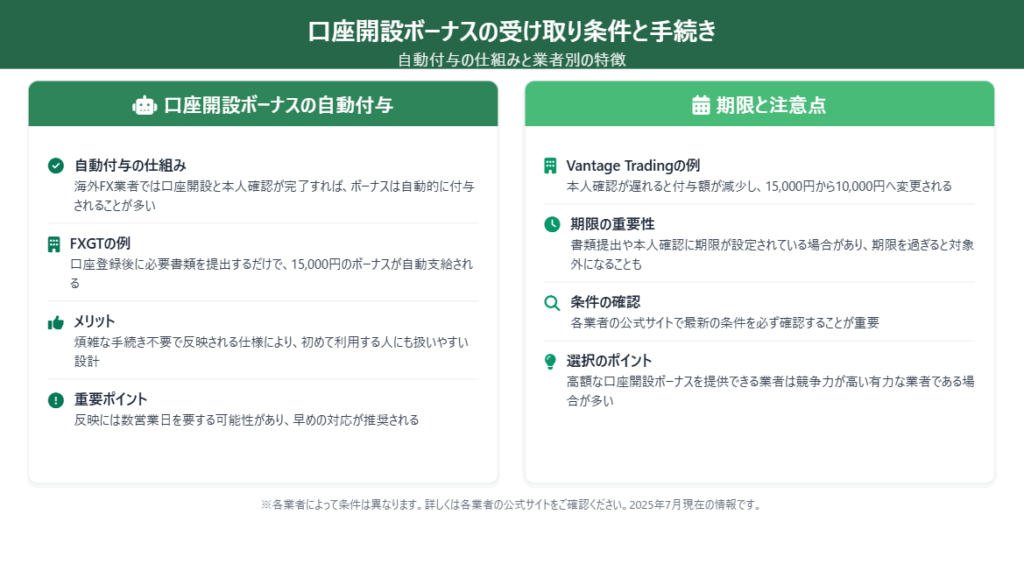 海外FX業者が提供する口座開設ボーナスは、業者ごとに受取方法や付与タイミングに違いがあります。