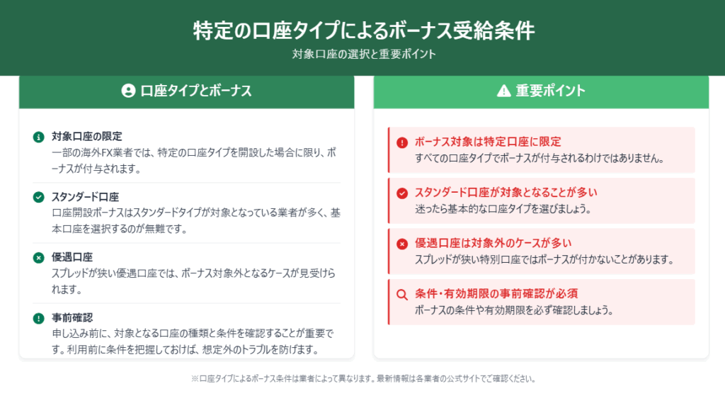 スプレッドが狭い優遇口座では、ボーナス対象外となるケースが見受けられます。