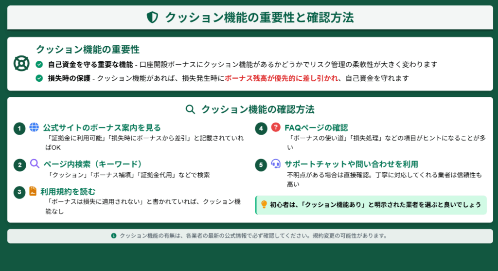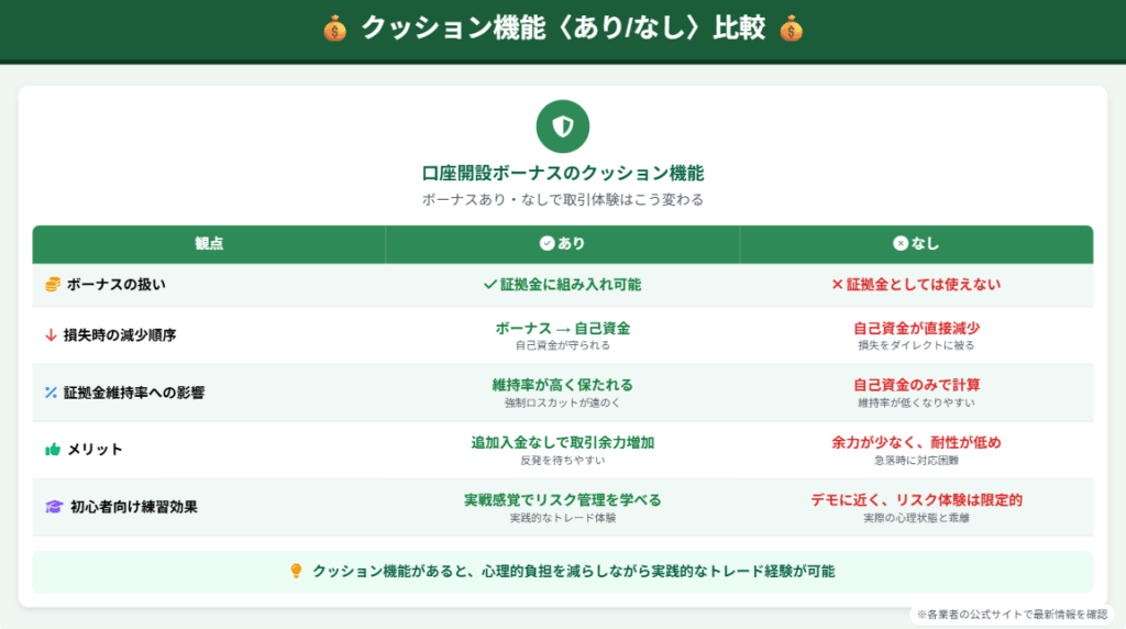 口座開設ボーナスにクッション機能があるかどうかで、リスク管理の柔軟性が大きく変わります。