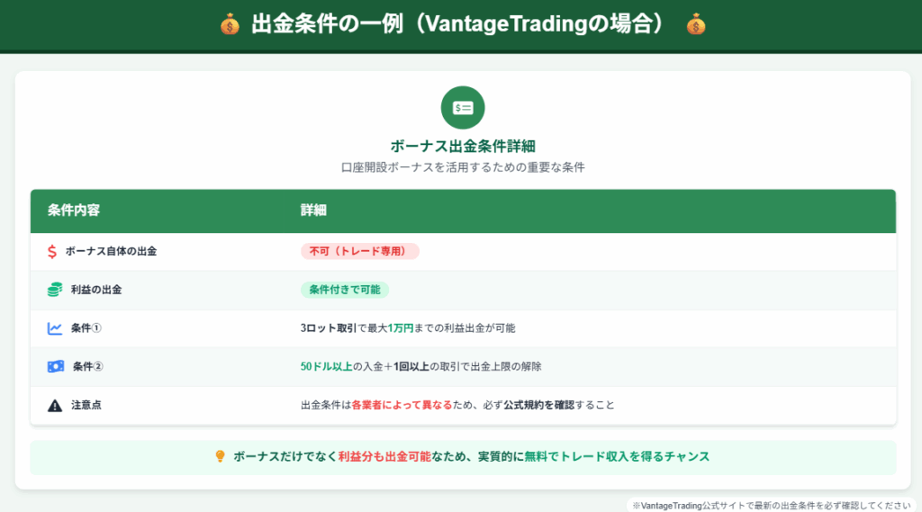 ボーナスそのものは出金できず、所定の取引量(ロット数)を満たすと利益分だけ引き出せる方式が主流です。