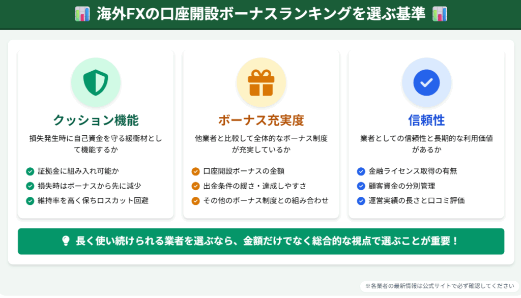 海外FXの口座開設ボーナスランキングを選ぶ基準を以下にまとめました。