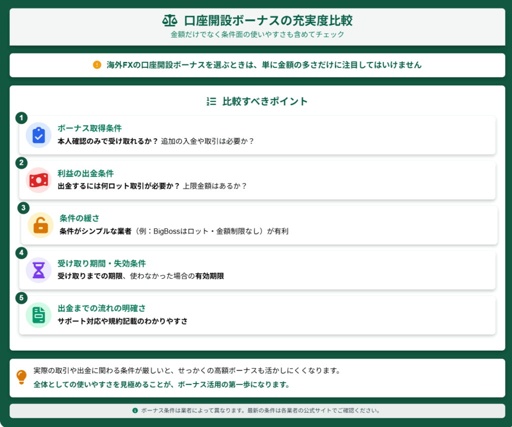 海外FXの口座開設ボーナスを選ぶときは、単に金額の多さだけに注目してはいけません。