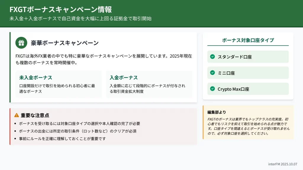 FXGTは定期的に口座開設ボーナスや入金ボーナスを提供しており、初心者でもリスクを抑えながら取引を開始できる点が高く評価されています。